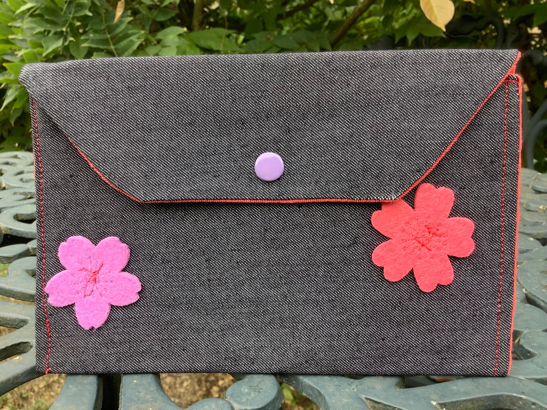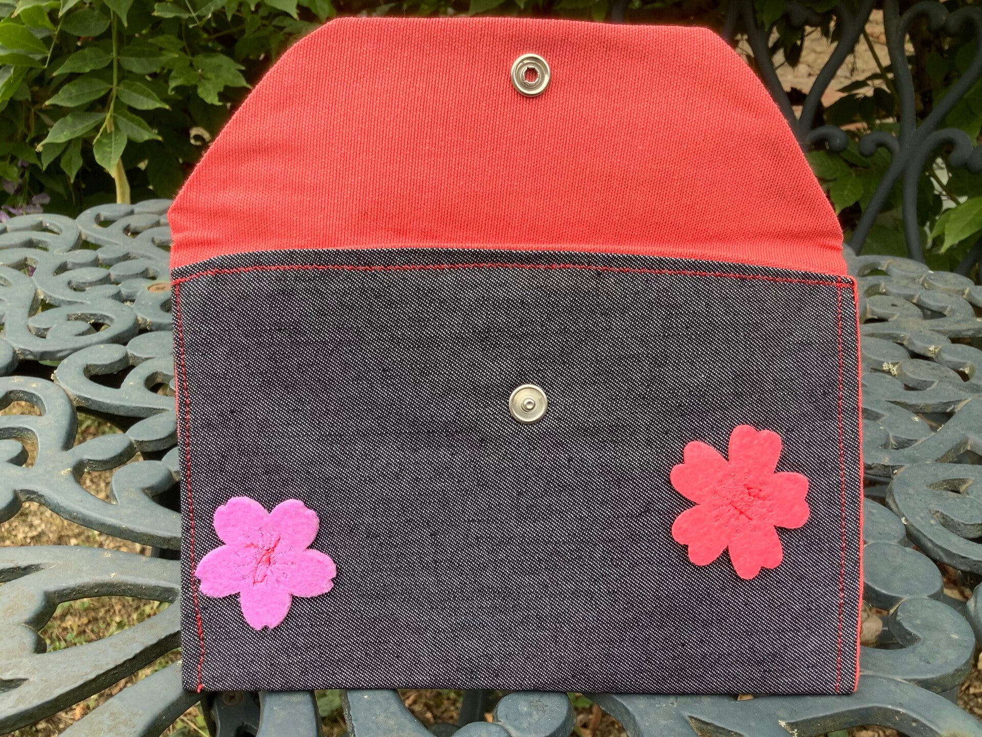 Agrémentée par deux fleurs de feutrine parme et fuschia, doublure couleur corail.