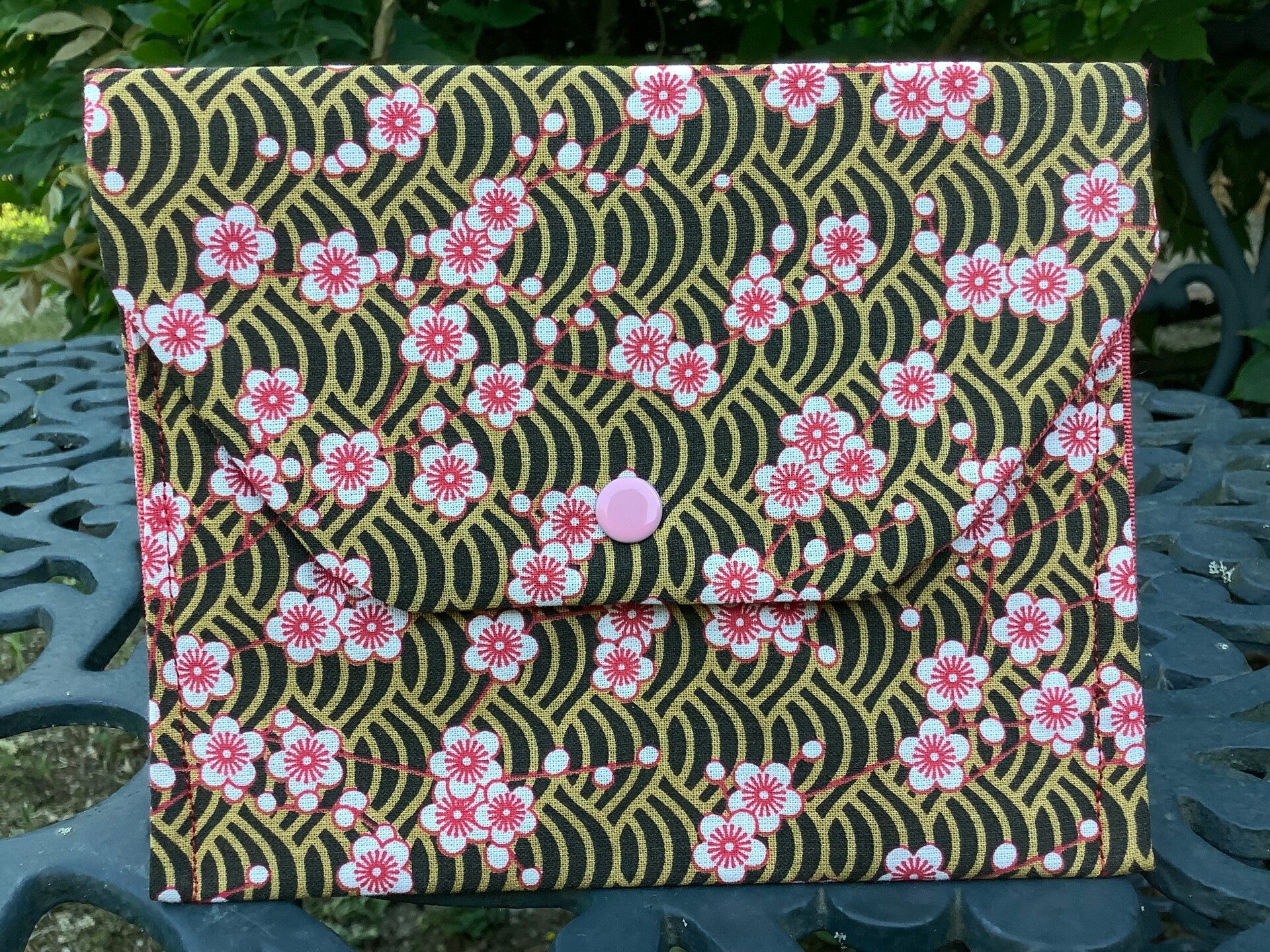 Doublée de coton rouge , elle se ferme par un bouton pression rose.