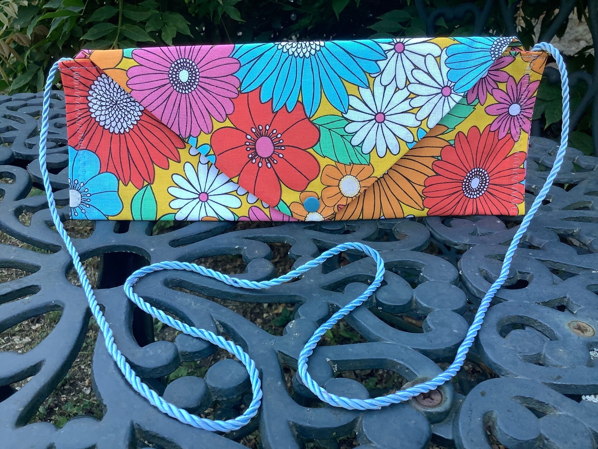 Doublée du même tissu extérieur, brodée et fermée par un bouton pression bleue, elle se porte en bandoulière par sa chaînette de coton torsadé.