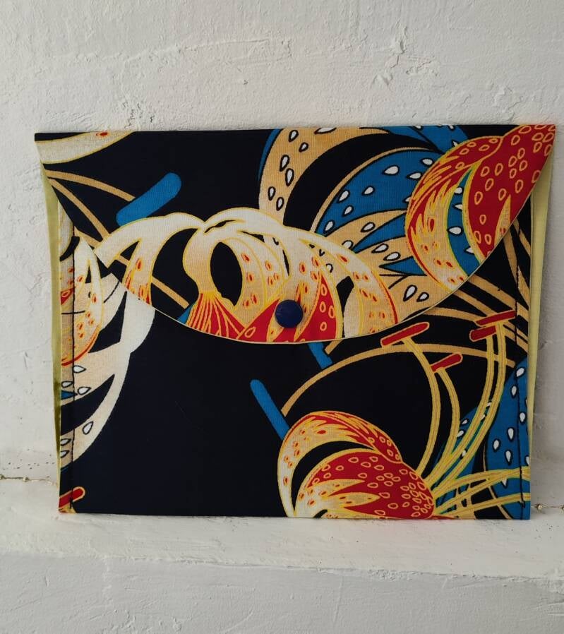Pochette assortie doublée de coton jaune, fermeture par bouton pression