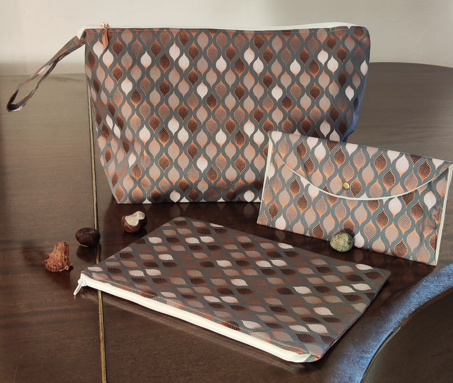 Composé de trois éléments dans un tissu de coton chatoyant et irisé.